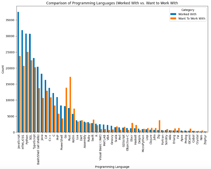 Programming Languages – Developers tend to be proficient in multiple languages, with Python, JavaScript, and SQL emerging as the dominant trio.